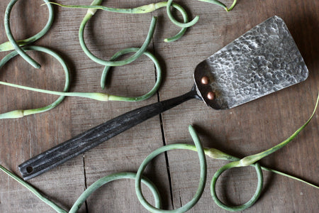 All of our kitchenware is hand forged in Maine, which is the process of heating metal to increase its malleability and then working it in various ways, often with a hammer and anvil. When the piece is finished, we remove the scale and apply a wax coating, which protects the surface and leaves a beautiful finish.
